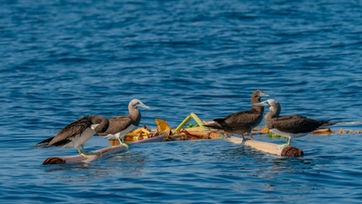 Ze waarschuwen ons dat walvissen spotten lastig is, het water zou nog wat te koud zijn. We varen eerst langs rotsen met brown boobies – ja ja, het zijn echt vogels – en fregatvogels. Prachtig gezicht.